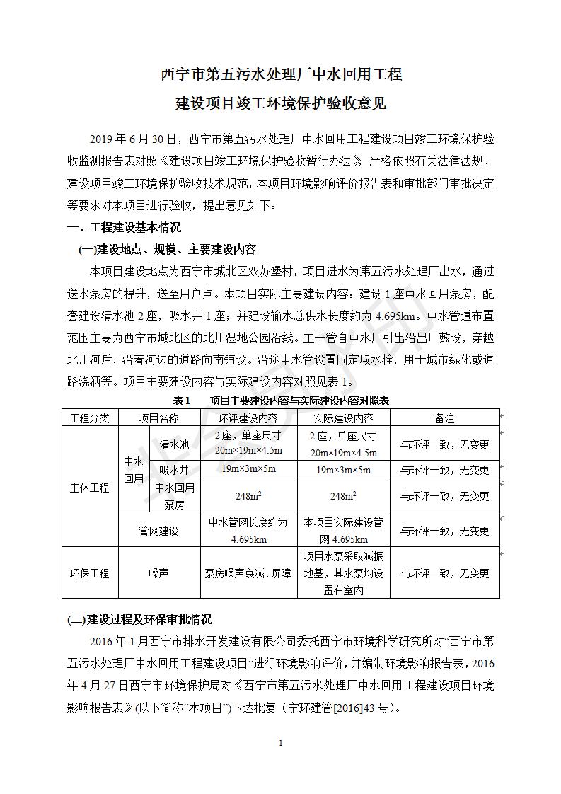 根據中華人民共和國國務院令第682號《國務院關于修改〈建設項目環(huán)境保護管理條例〉的決定》和《建設項目竣工環(huán)境保護驗收暫行辦法》(國務院令682號),西寧市第五污水處理廠中水回用工程建設項目(包括竣工環(huán)境保護驗收監(jiān)測報告表和驗收意見)公示如下。 一、項目名稱:西寧市第五污水處理廠中水回用工程建設項目 二、地點:西寧市城北區(qū)廿十里鋪雙蘇堡 三、建設單位:西寧市排水開發(fā)建設有限公司