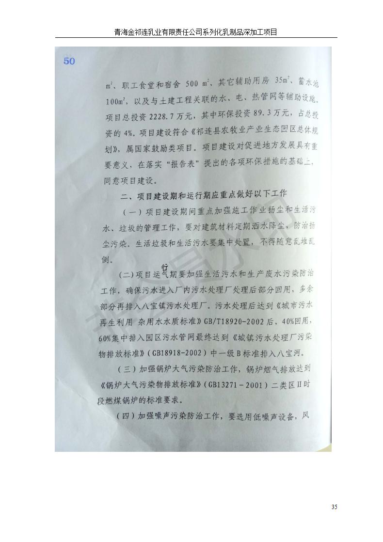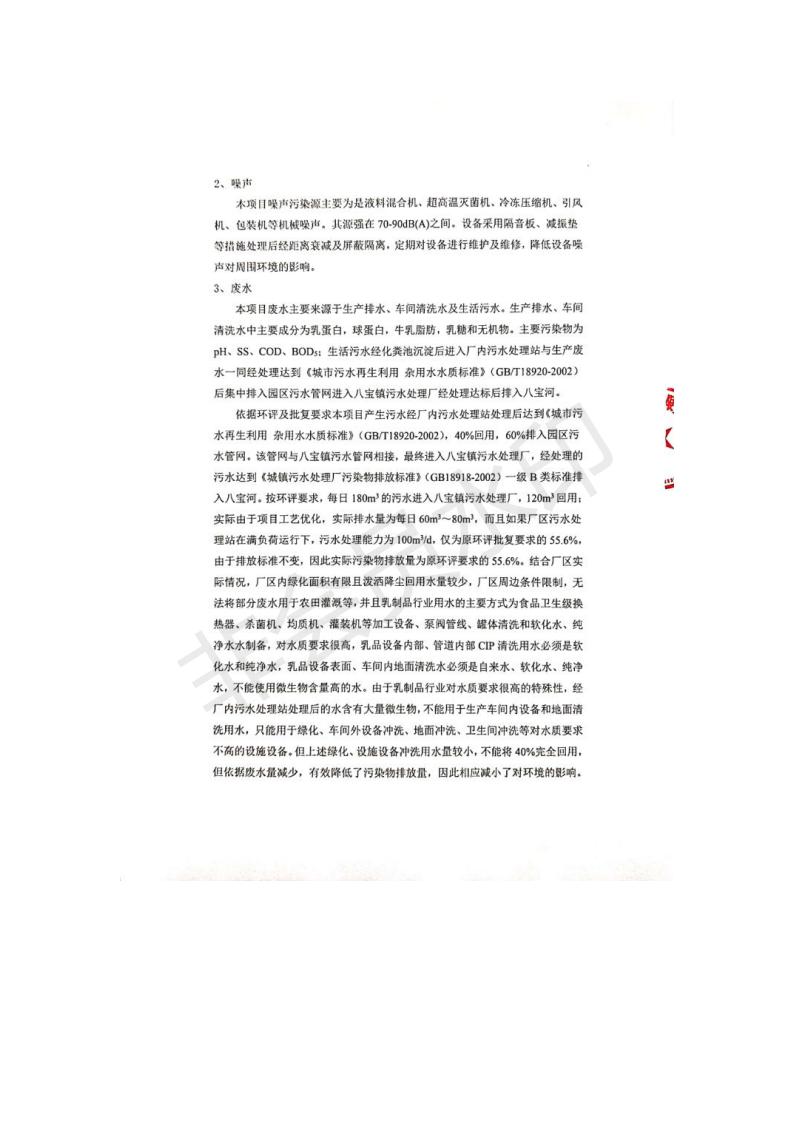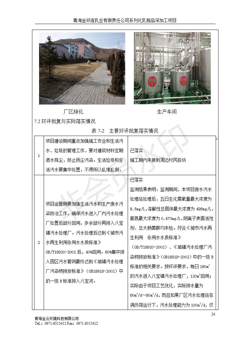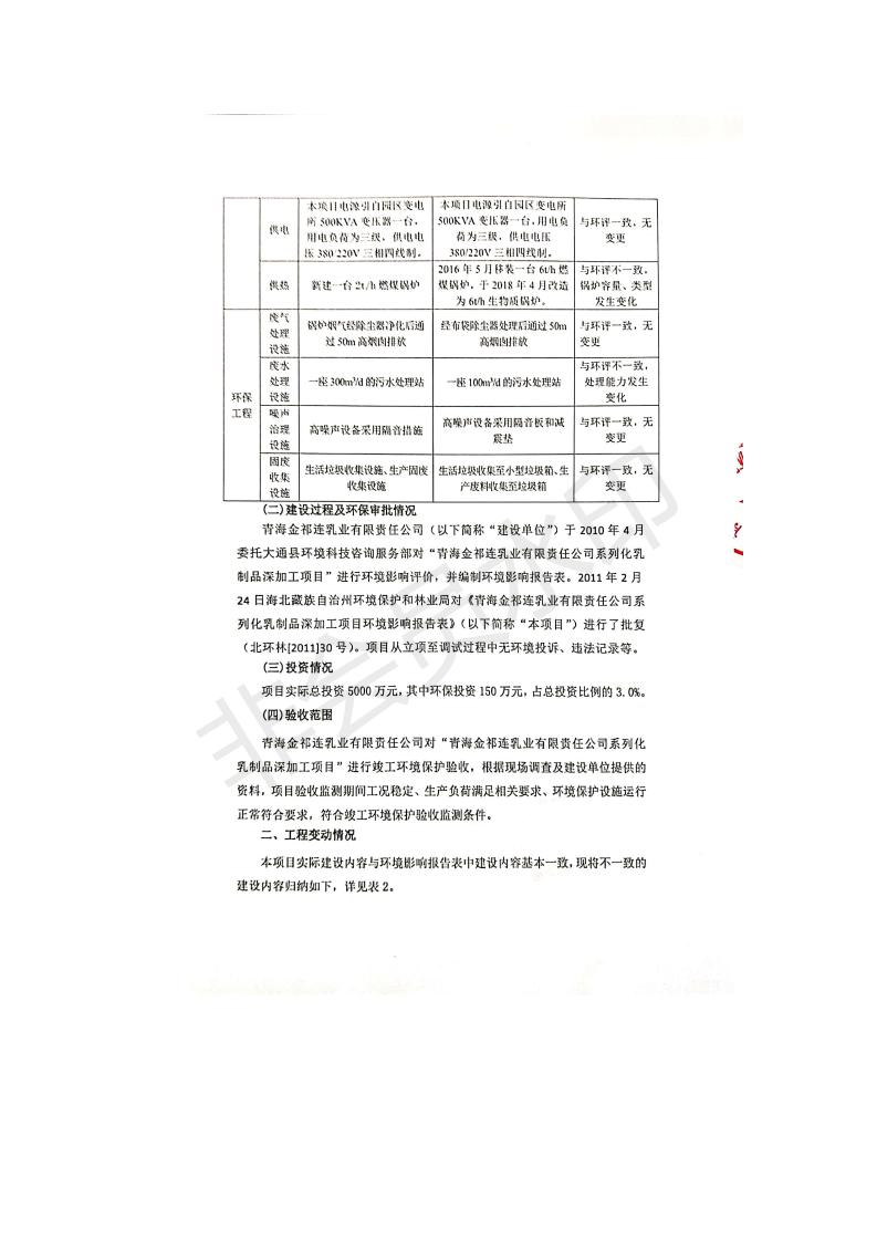 根據(jù)中華人民共和國國務院令第682號《國務院關于修改〈建設項目環(huán)境保護管理條例〉的決定》和《建設項目竣工環(huán)境保護驗收暫行辦法》(國務院令682號),青海金祁連乳業(yè)有限責任公司系列化乳制品深加工項目(包括竣工環(huán)境保護驗收監(jiān)測報告表和驗收意見)公示如下。 一、項目名稱:青海金祁連乳業(yè)有限責任公司系列化乳制品深加工項目 二、地點:海北藏族自治州祁連縣冰溝農牧產業(yè)化生態(tài)園區(qū) 三、建設單位:青海金祁連乳業(yè)有限責任公司 四、建設內容:本項目新征工業(yè)用地40畝,新建生產車間2200 m2、采用多聯(lián)跨鋼結構廠房,跨度為24米,長度為80米,柱間距為6米,標高為4.8米。廠房內部根據(jù)產品生產工藝及工序要求分為不同的工作區(qū)域和車間辦公室。建設有保鮮冷庫800 m2、普通倉庫500m2、污水處理站房160 m2、鍋爐房和配電室159 m2、綜合辦公樓1200 m2、職工食堂和宿舍500 m2、其他輔助用房35 m2、蓄水池100 m2以及與土建工程相關聯(lián)的水、電、熱官網等輔助設施。 五、聯(lián)系人:張工 六、聯(lián)系電 話:0971-6515411 七、公示時間:二〇一九年七月十日至二〇一九年八月六日 公示期間,對上述公示內容如有異議,請以書面形式反饋,個人須署真實姓名,單位須加蓋公章。