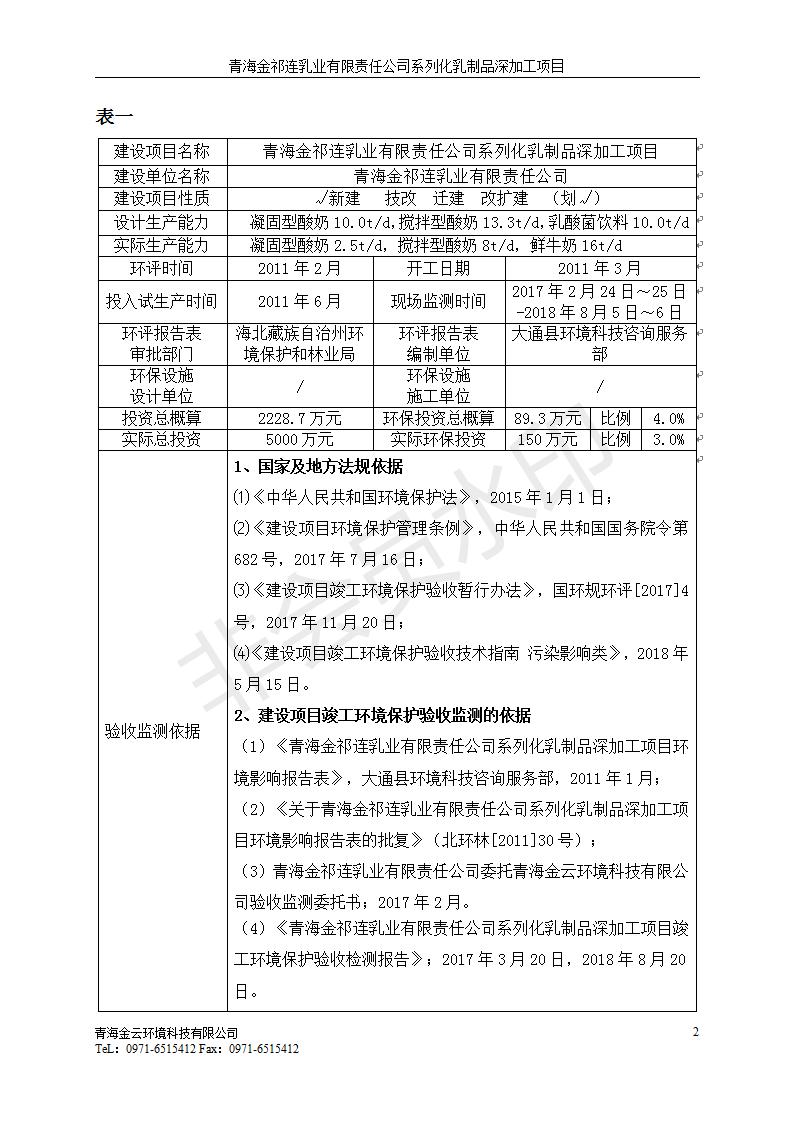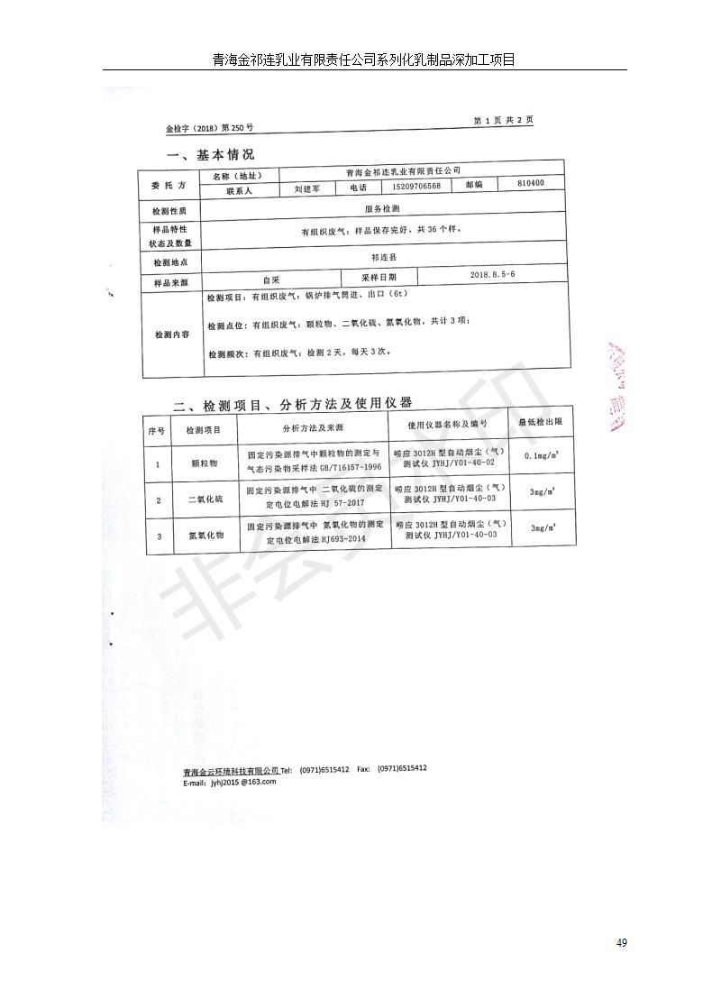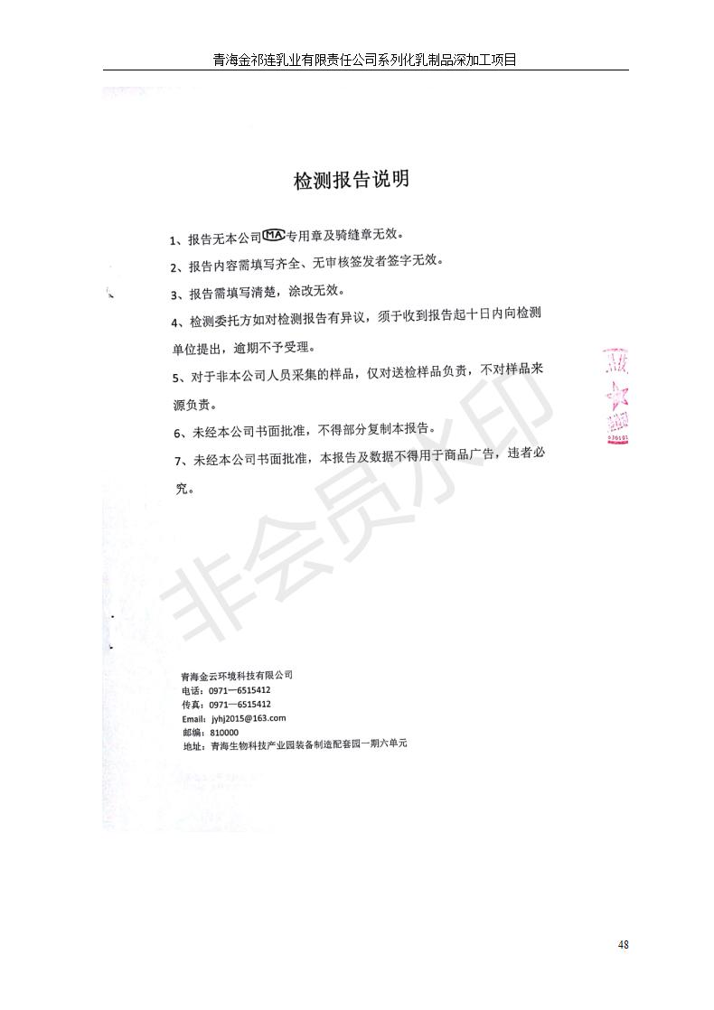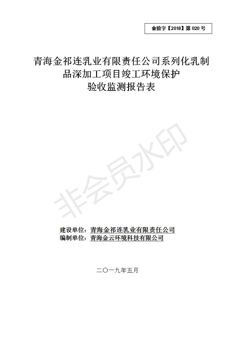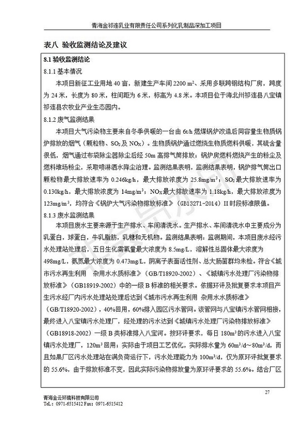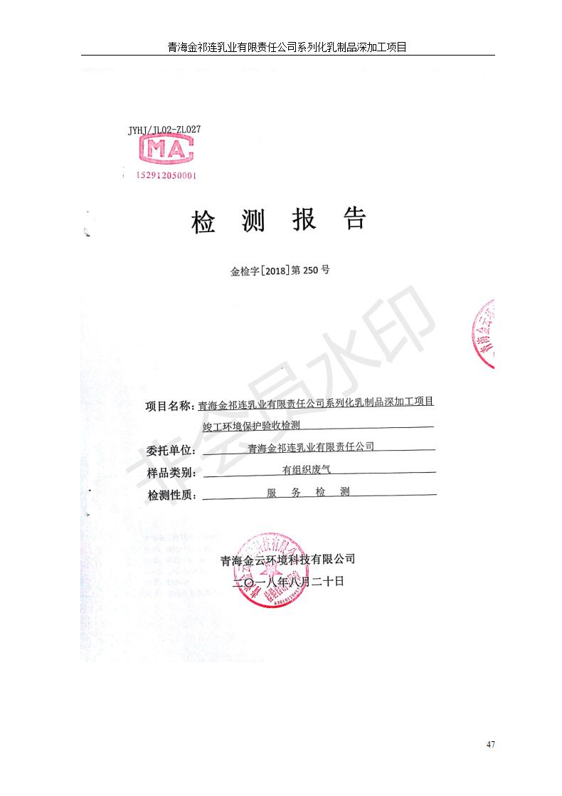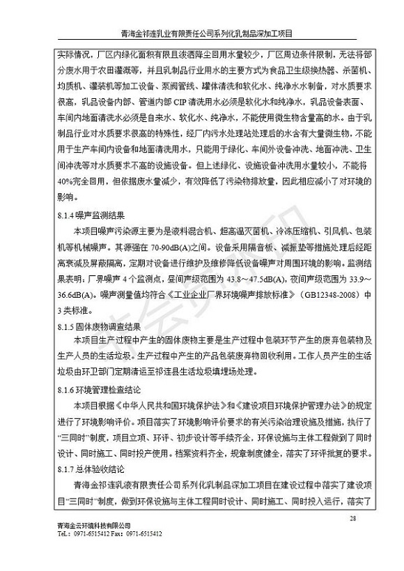 青海金祁連乳業(yè)有限責任公司系列化乳制品深加工項目竣工環(huán)境保護驗收監(jiān)測報告表公示發(fā)布日期:(2019-7-10) 點擊次數(shù):2263 |