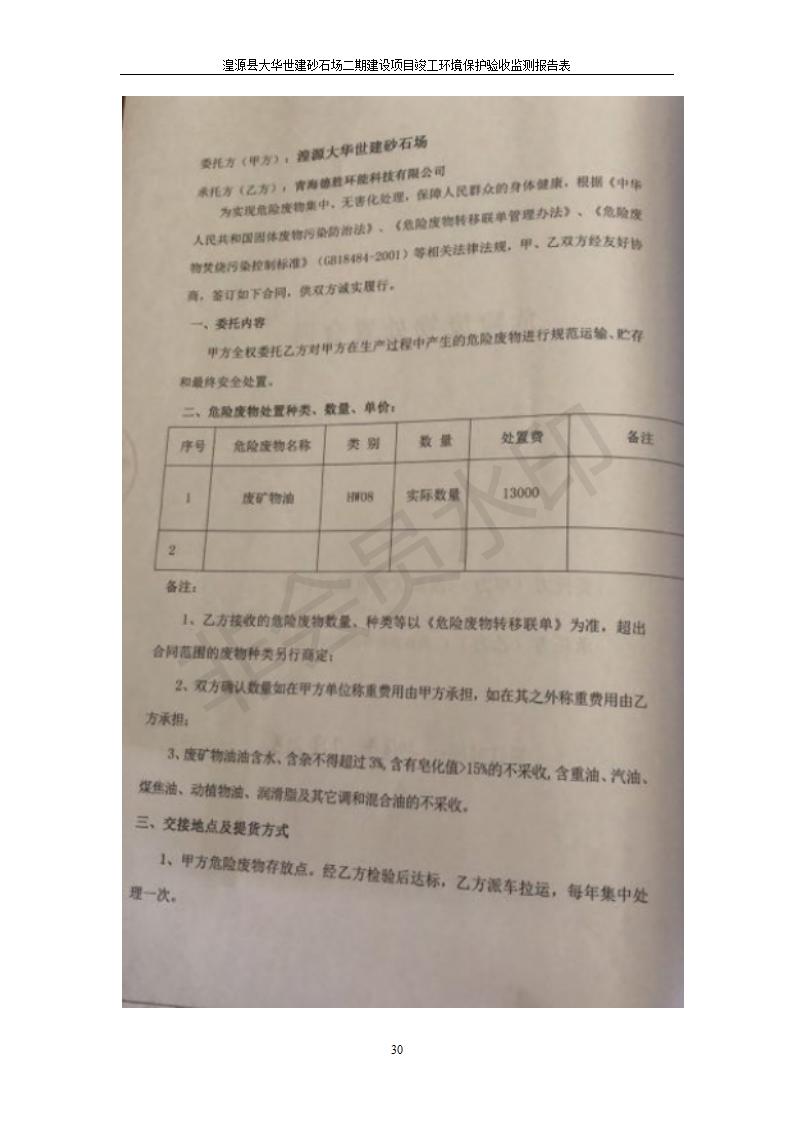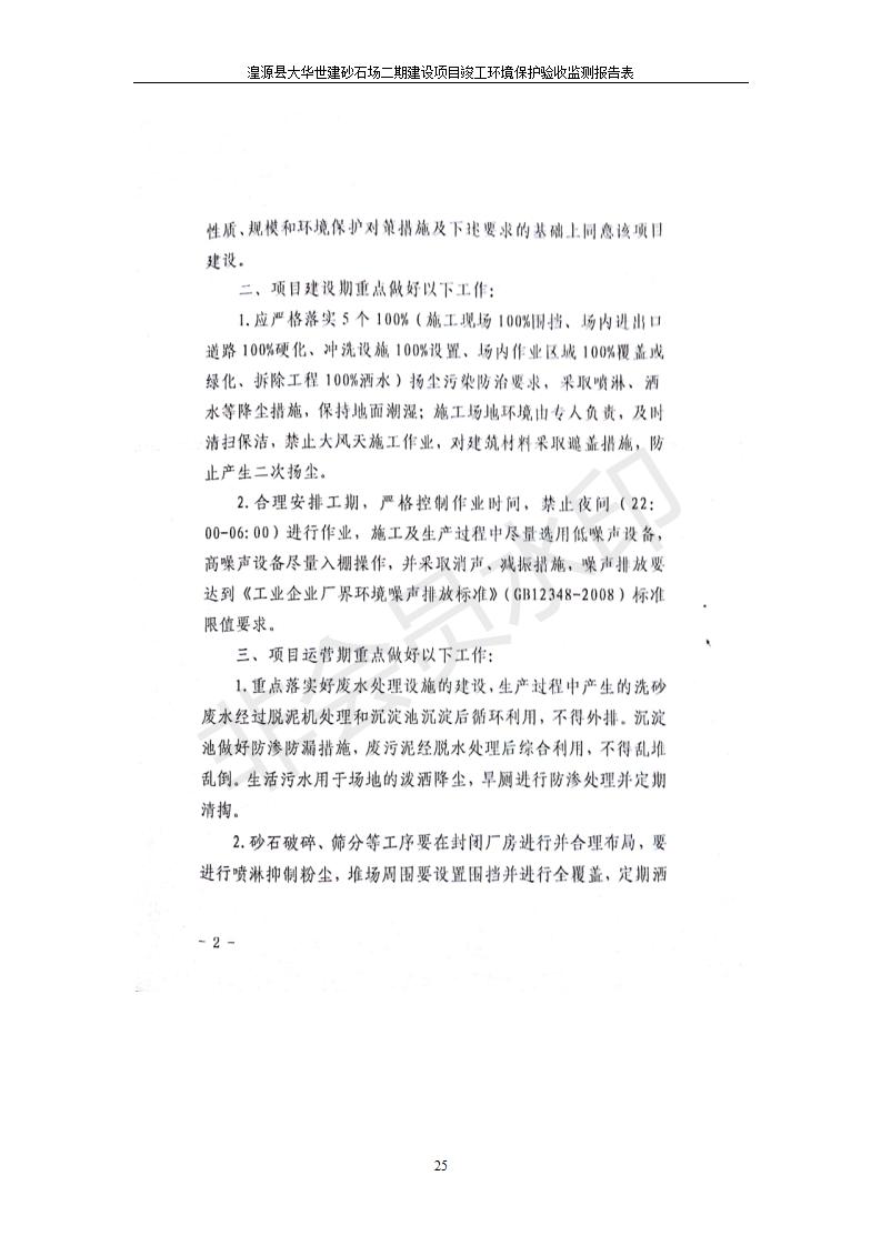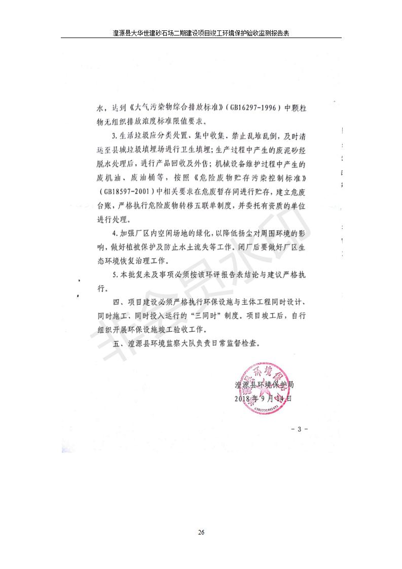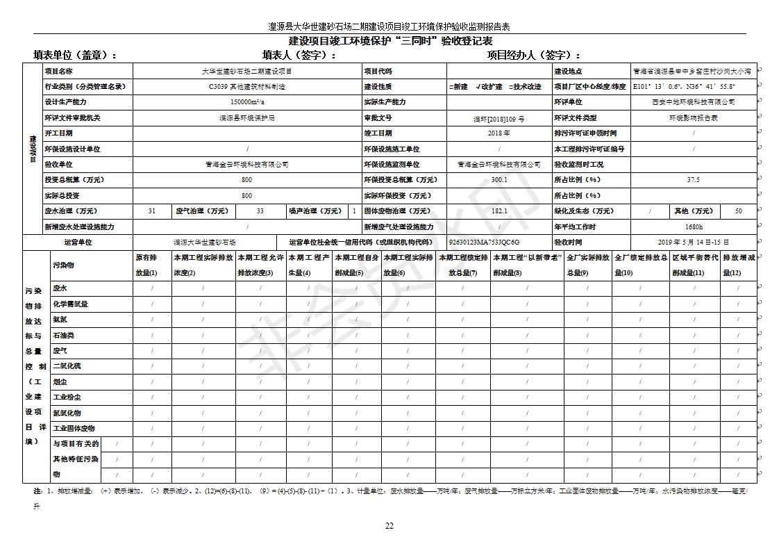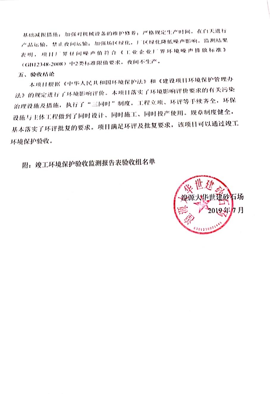 根據(jù)中華人民共和國國務(wù)院令第682號《國務(wù)院關(guān)于修改〈建設(shè)項(xiàng)目環(huán)境保護(hù)管理?xiàng)l例〉的決定》和《建設(shè)項(xiàng)目竣工環(huán)境保護(hù)驗(yàn)收暫行辦法》(國務(wù)院令682號),湟源大華世建砂石場湟源縣大華世建砂石場二期建設(shè)項(xiàng)目(包括竣工環(huán)境保護(hù)驗(yàn)收監(jiān)測報(bào)告表和驗(yàn)收意見)公示如下。 一、項(xiàng)目名稱:湟源縣大華世建砂石場二期建設(shè)項(xiàng)目 二、地點(diǎn):湟源縣申中鄉(xiāng)窯莊村沙崗大小灣 三、建設(shè)單位:湟源大華世建砂石場 四、建設(shè)內(nèi)容:項(xiàng)目主要建設(shè)砂石料產(chǎn)品加工生產(chǎn)區(qū)、原料堆場、產(chǎn)品堆場、辦公區(qū)等。五、聯(lián)系人:張工 六、聯(lián)系電 話:0971-6515411 七、公示時(shí)間:二〇一九年七月二十五日至二〇一九年八月二十一日公示期間,對上述公示內(nèi)容如有異議,請以書面形式反饋,個(gè)人須署真實(shí)姓名,單位須加蓋公章。