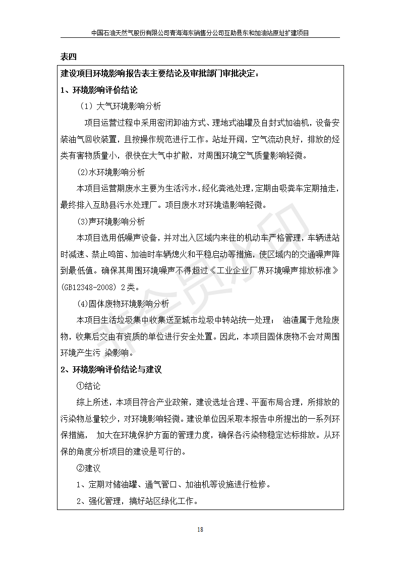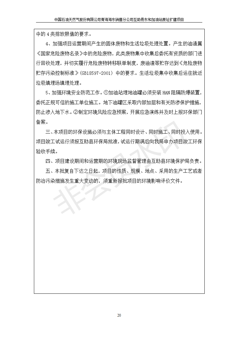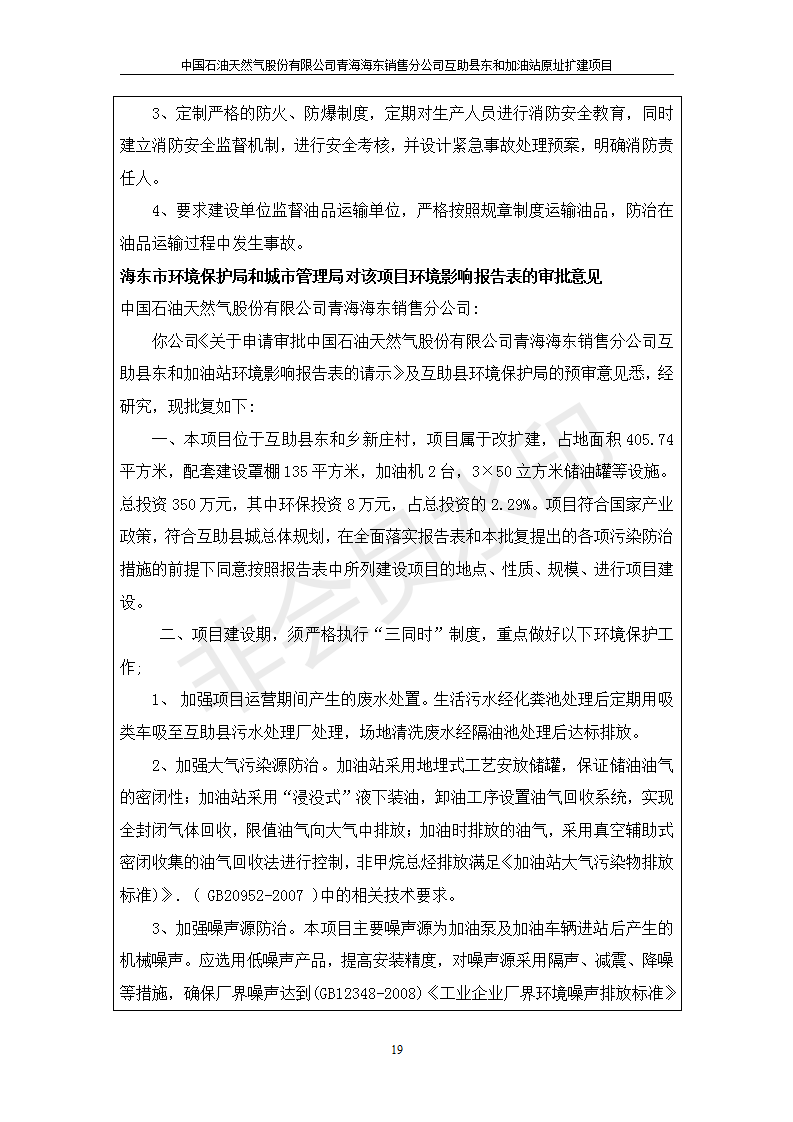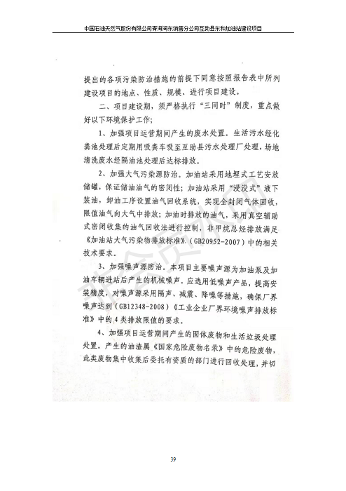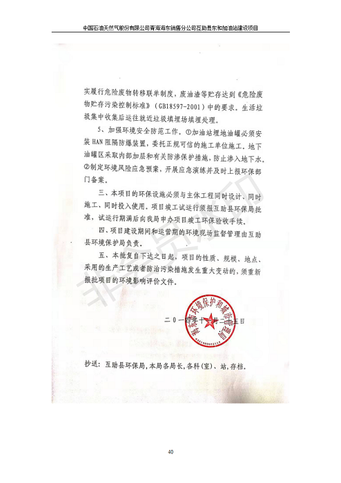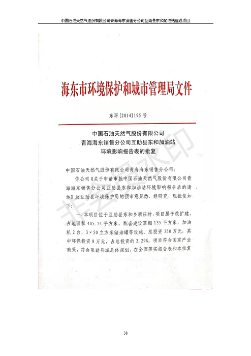 根據(jù)中華人民共和國國務(wù)院令第682號《國務(wù)院關(guān)于修改〈建設(shè)項目環(huán)境保護(hù)管理條例〉的決定》和《建設(shè)項目竣工環(huán)境保護(hù)驗收暫行辦法》(國務(wù)院令682號),互助縣東和加油站原址擴(kuò)建項目(包括竣工環(huán)境保護(hù)驗收監(jiān)測報告表和驗收意見)公示如下。 一、項目名稱:互助縣東和加油站原址擴(kuò)建項目 二、地點:互助縣威遠(yuǎn)鎮(zhèn)東和鄉(xiāng)新莊村 六、聯(lián)系電話:0971-6515411 七、公示時間:二〇一九年九月二十七日至二〇一九年十月二十九日 公示期間,對上述公示內(nèi)容如有異議,請以書面形式反饋,個人須署真實姓名,單位須加蓋公章。